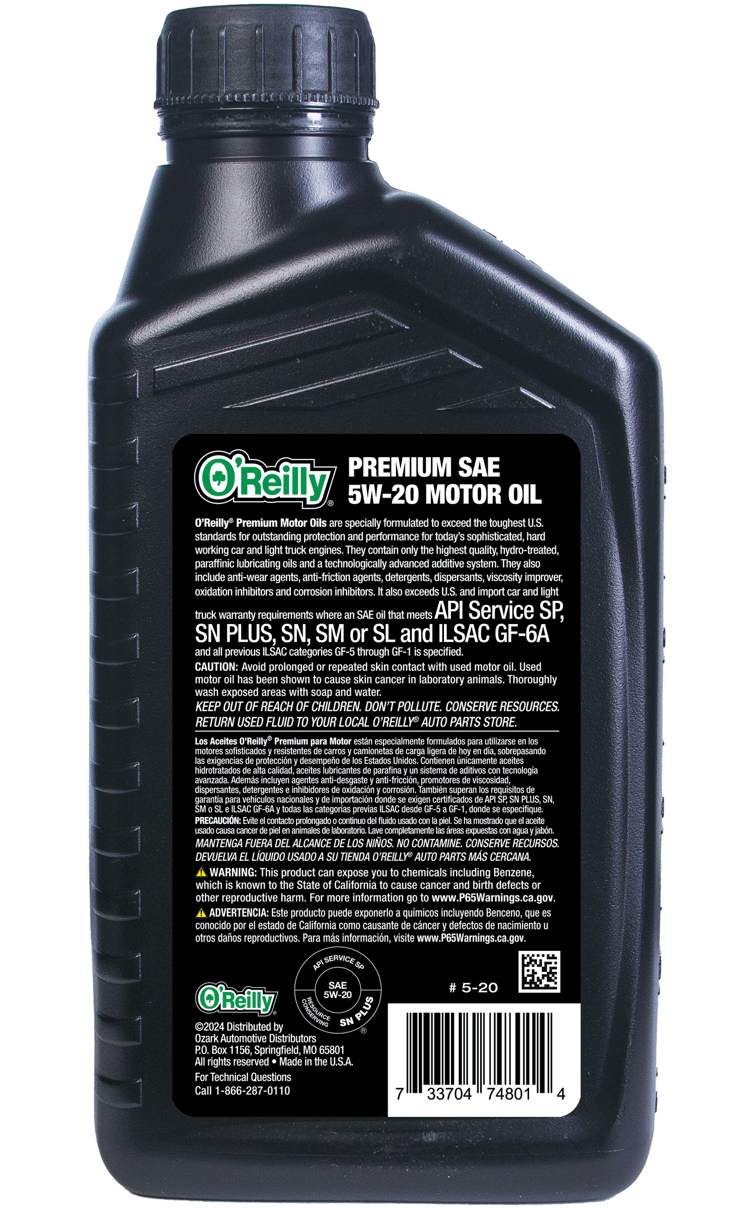O’Reilly Multigrade Motor Oil meets the requirements of API SQ service category and is available in viscosity grades: SAE 5W-20, 5W-30, 10W-30, 10W-40, and 20W-50. O’Reilly Multigrade Motor Oil SAE 5W-20, 5W-30, and 10W-30 meet or exceed the demanding requirements of the International Lubricant Standardization and Approval Committee (ILSAC) GF-7A. ILSAC GF-7A comprises the latest standard for passenger cars, vans, light trucks, and sport utility vehicles motor oils.