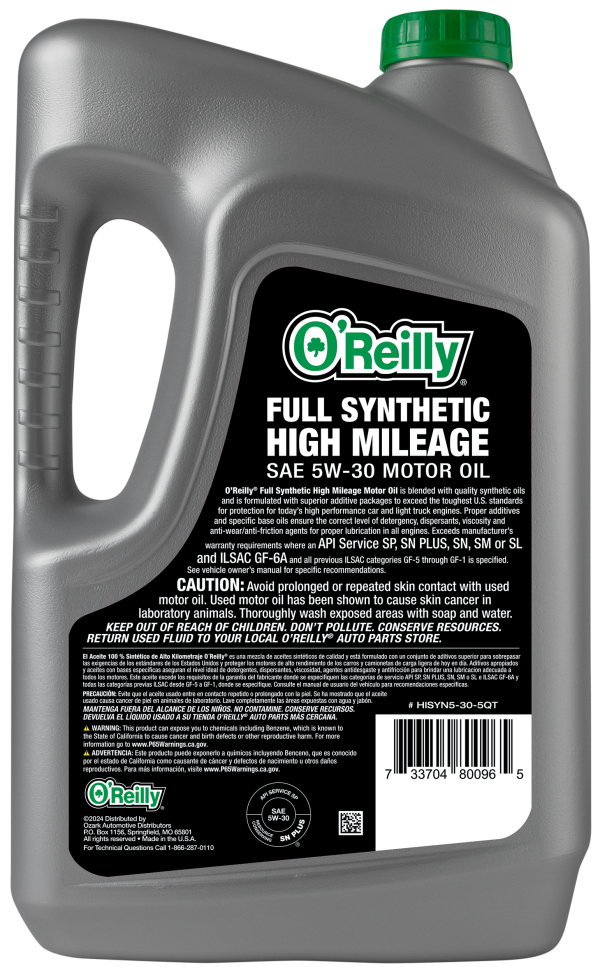 O’Reilly High Mileage Full Synthetic Motor Oil is blended with quality synthetic base oils plus formulated with a superior additive package to exceed the toughest U.S. Standards for protection for today’s high mileage cars or light-duty trucks by slowing the aging process with the correct level of detergency, dispersants, viscosity, anti-wear/anti-friction agents plus seal conditioning additives to give longer life to aging engines with over 75,000 miles. Offers Extended Friction Protection.